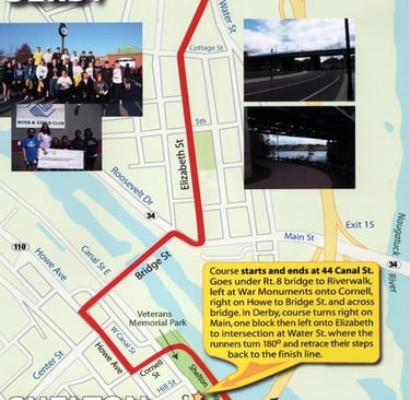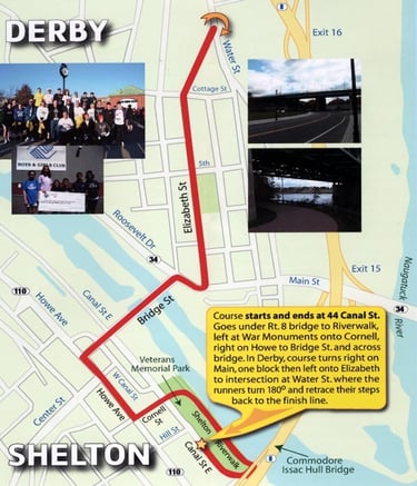 The race begins along Canal Street and the Shelton Riverwalk, with the Housatonic on one side and the old factory buildings on the other.